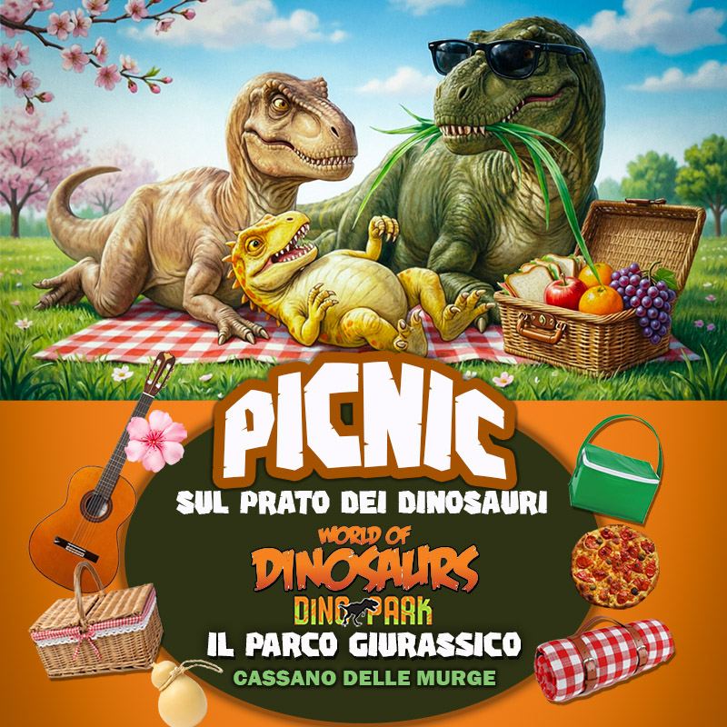 4) Possibilità di portare cibo da casa e fare picnic con i dinosauri sul grande prato panoramico o in altre aree verdi, stendendo il classico telo da picnic o una coperta sull'erba. Non disponiamo di tavoli e sedute. VIETATO introdurre barbecue/braci/fornacelle.